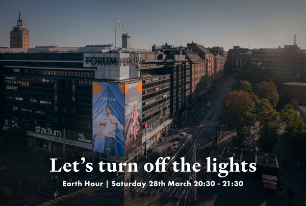 Maailman laajimmalle levinnyt ympäristötapahtuma, Earth Hour, järjestetään jälleen lauantaina 28. maaliskuuta 2026 klo 20:30–21:30. Forum osallistuu sammuttamalla kauppakeskuksen julkisivun valaistuksen ja osan valomainoksista tunnin ajaksi ympäristön hyväksi. Lue lisää ja osallistu kanssamme!