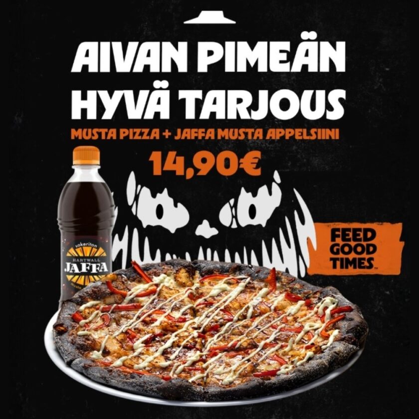 Herkulliseen ohutpohjaiseen Mustaan pizzaan sisältyy kolme vapaavalintaista täytettä, halutessasi lisäämme pizzan päälle valkosipulikastiketta pitämään vampyyrit loitolla.. Juomaksi Jaffa Musta Appelsiini, pimeään yhteishintaan 14,90. Rajoitettu erä.